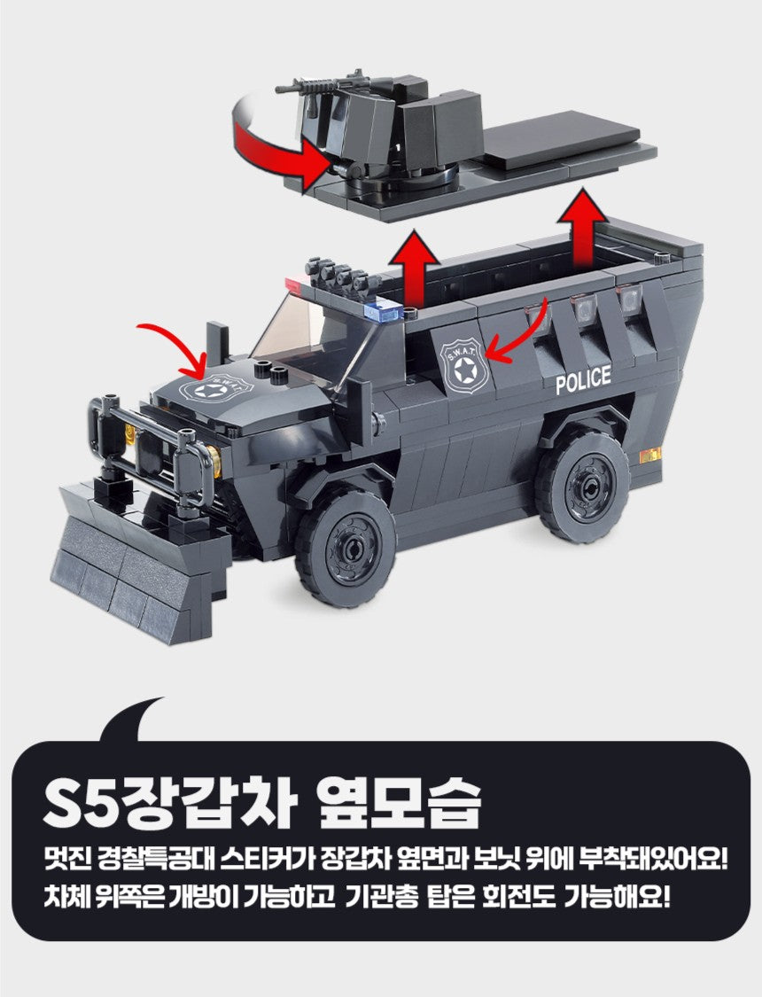 ★S5装甲車とコンテナ、警察特殊部隊フィギュアのセット。