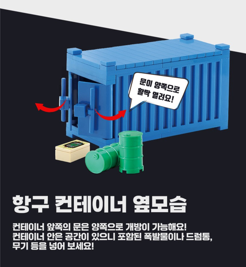 装甲車は上部が回転可能。コンテナは扉が開き、中に付属のドラム缶や武器などを入れることができます。